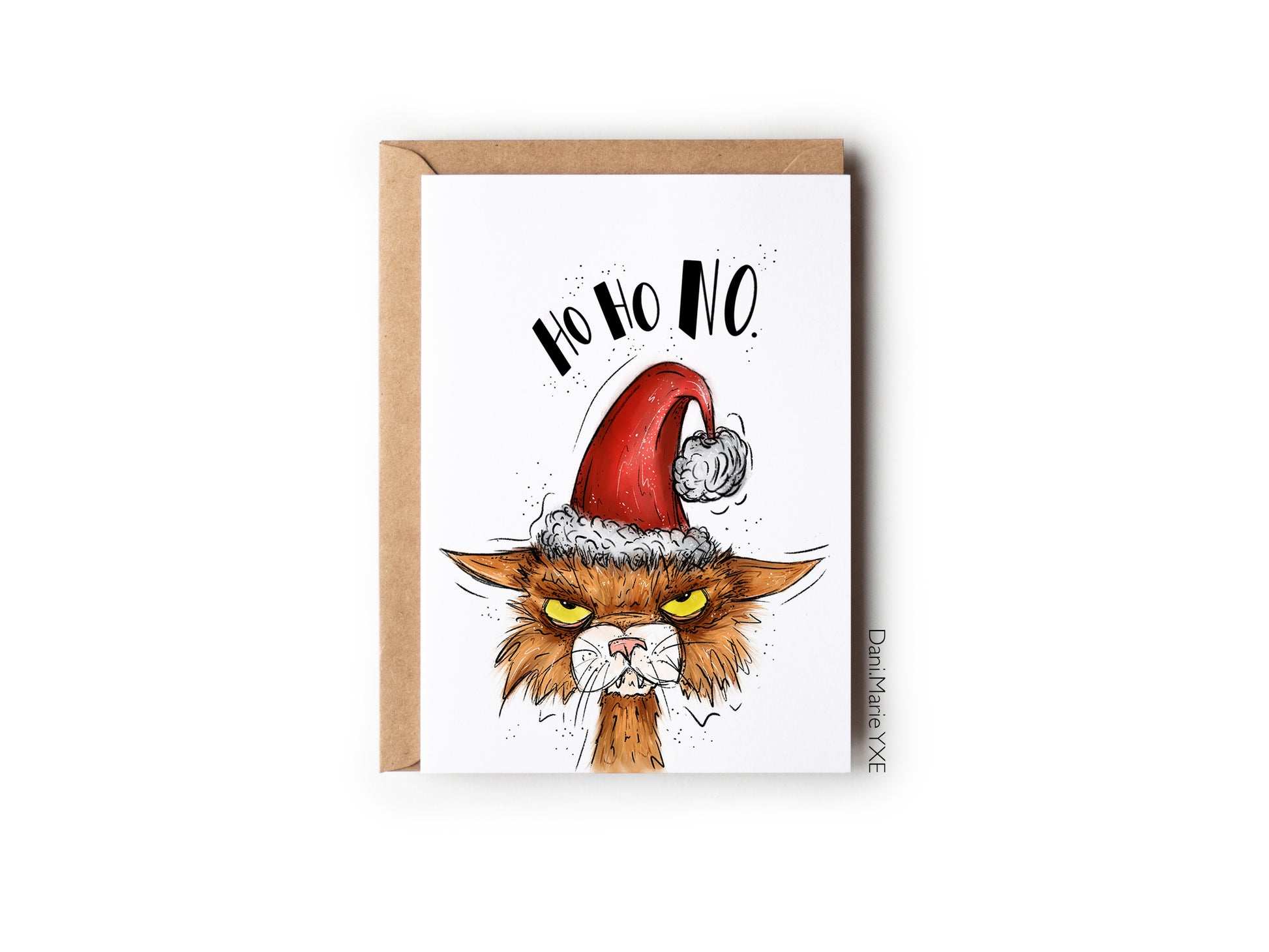The card reads "Ho Ho No!" with an illustration of a grumpy orange kitty wearing a Santa hat. The perfect card for the certain someone in your life who isn't a fan of the holiday season!